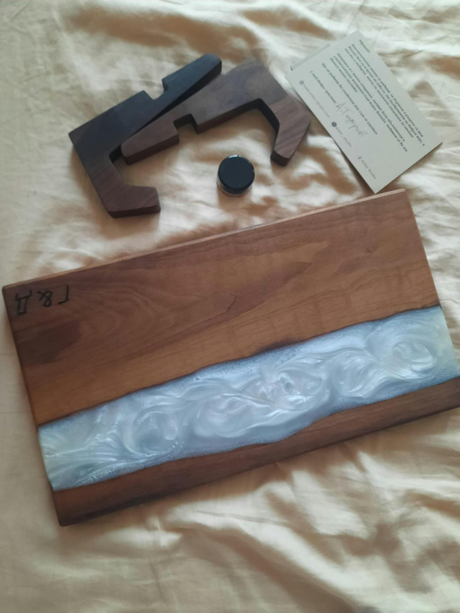 Наричат я течно стъкло. Тя е по-твърда от дървото, издържа на температури до 50 градуса и е със сертификат за безопасност за допир с храни, което я прави повече от перфектно допълнение към нашите дъски.